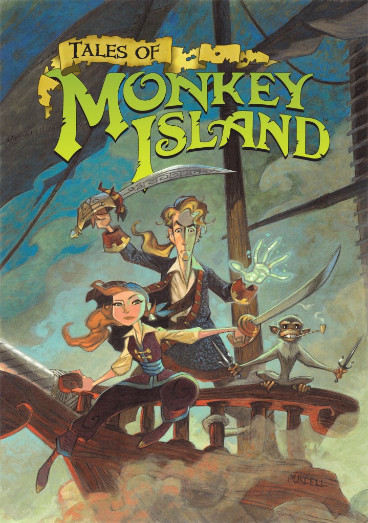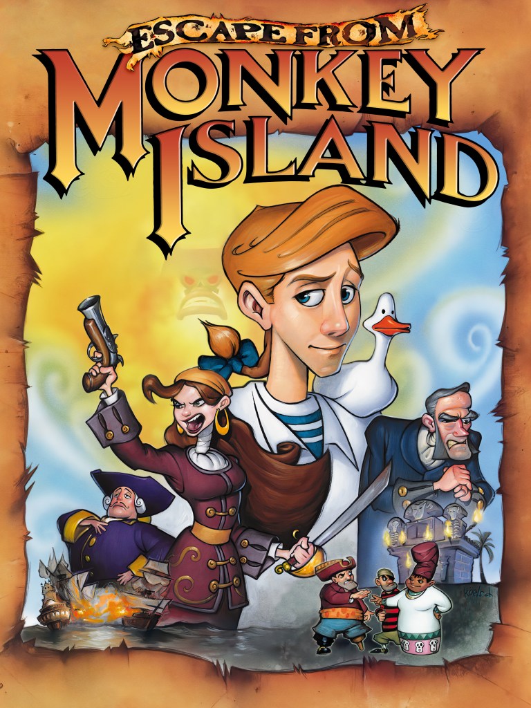Cover art for two of the Monkey Island games, courtesy of The Monkey Island SCUMM Bar and Lucas Arts Posters at the International House of Mojo. Original box art by Michael Koelsch (left) and Steve Purcell (right).